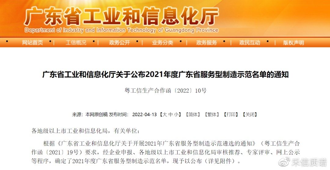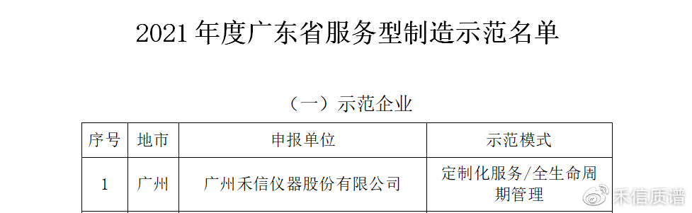 4月13日,广东省工业和信息化厅根据《广东省工业和信息化厅关于开展2021年广东省服务型制造示范遴选的通知》(粤工信生产合作函〔2021〕19号)要求,经企业申报、各地级以上市工业和信息化局审核推荐、专家评审、网上公示等程序,确定了2021年度广东省服务型制造示范名单,广州禾信仪器股份有限公司成功入选该名单“示范企业”。