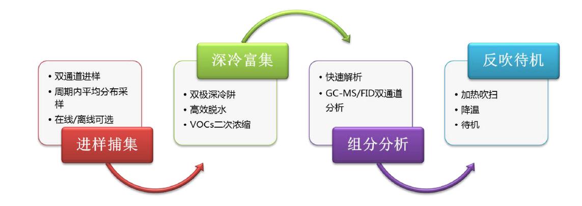 产品介绍 AC-GCMS 1000型VOCs吸附浓缩在线监测系统用于大气环境监测领域,实时分析环境空气一百多种挥发性/半挥发性有机化合物(VOCs/SVOCs),为用户提供实时、准确的空气VOCs组分信息。系统检测限低、能耗低、无盲点采样、操作简单、易维护,可安装在常规实验室或监测车内运行。 产品原理 环境空气、标准气体等样品通过进样阀自动选择进入双通道气体捕集系统;并通过双级深冷富集系统实现对气体中VOCs全组分的高效捕集浓缩,其中一级深冷完成VOCs捕集及干燥,二级深冷实现VOCs二次聚焦浓缩;再经超快速升温将样品加热气化并进入GCMS完成定性与定量分析。