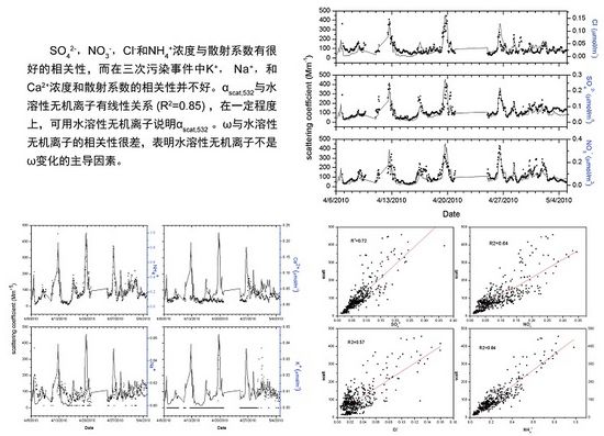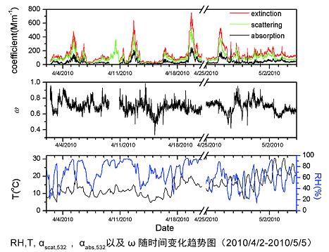 激光从高反射镜一端引入到XG 1000腔体中,光束在两个高反射镜之间来回反射,在高反射镜的另一端用光电倍增管来监测激光光强的衰减过程,并通过激光光强在腔体内的衰减方程推算出激光的衰荡时间。通过分别检测样品和背景气体的衰荡时间,计算出颗粒物的消光系数。 应用案例 上海市大气气溶胶的光学性质研究 XG 1000监测了2010/4/2-2010/5/5期间上海市大气气溶胶的消光系数、能见度,并结合积分式浊度计等仪器获得监测期间气溶胶的光散射系数、吸收系数和单次散射反照率随时间的变化,光学性质与风向的关系等,在上海市气溶胶光学性质的研究中发挥了重要作用。 气溶胶消光系数、单次散射反射反照率随时间变化